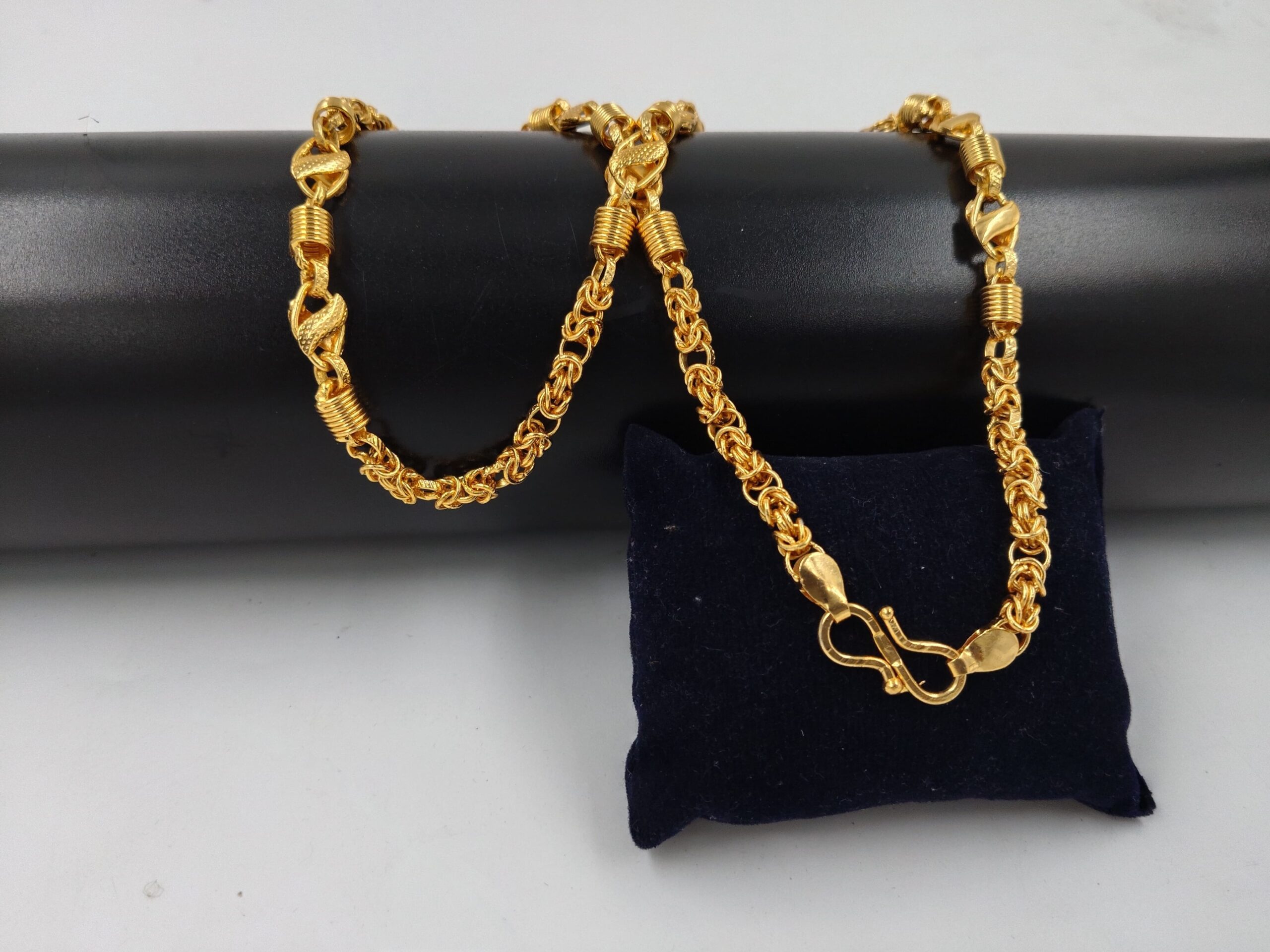 Add a touch of timeless elegance to your jewellery collection with this beautifully crafted gold-tone chain. Featuring intricate floral-inspired links, this designer chain is a perfect blend of tradition and modern style. The detailed workmanship and smooth finish give it a luxurious look, making it an ideal piece for festive occasions, weddings, or as a statement accessory for daily wear.