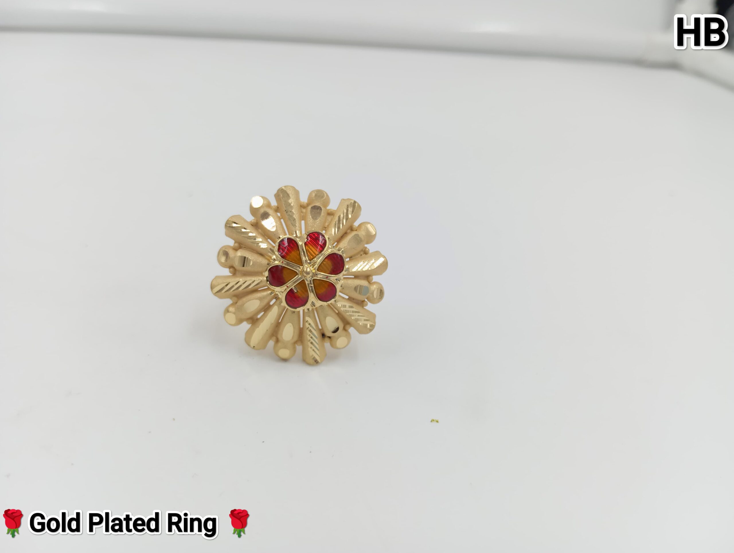 Add a touch of luxury to your jewelry collection with this intricately designed gold-plated ring. Featuring a floral motif with fine detailing and a stunning ruby-colored stone at its center, this ring is perfect for any occasion. Handcrafted with precision, it blends traditional charm with contemporary elegance. Ideal for gifting or enhancing your own style, this exquisite piece is a must-have for jewelry lovers.
