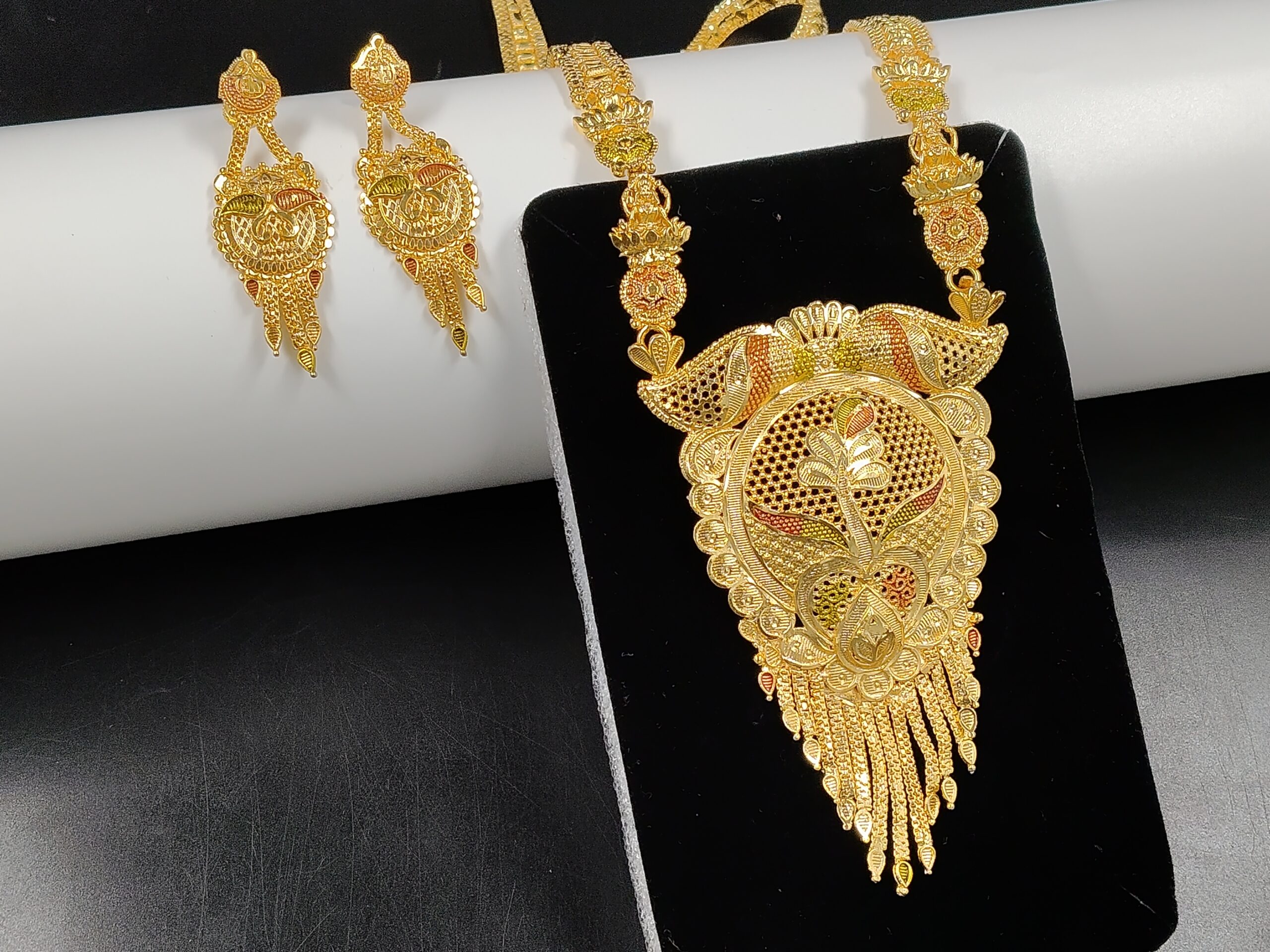 This long set is a beautifully crafted traditional gold jewelry piece that reflects elegance, grandeur, and intricate artistry. The set consists of a statement necklace and matching long earrings, both showcasing a fine blend of traditional motifs and modern finesse.