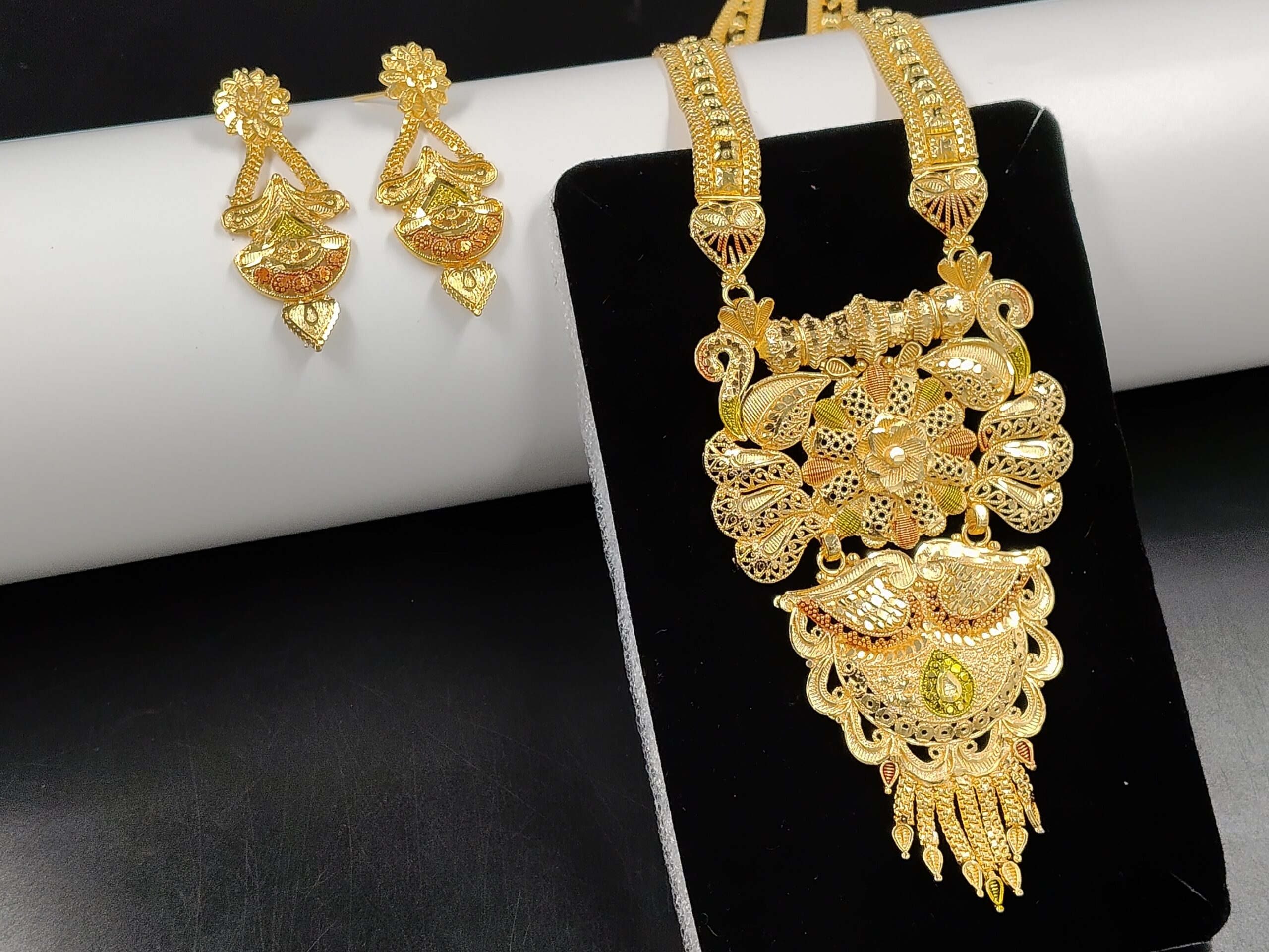 This long set is a beautifully crafted traditional gold jewelry piece that reflects elegance, grandeur, and intricate artistry. The set consists of a statement necklace and matching long earrings, both showcasing a fine blend of traditional motifs and modern finesse.